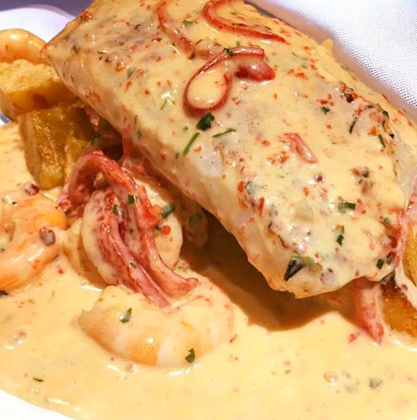 Calderera Marina Delicado caldo de congrio con pulpo, mejillas de merluza, camarones, choritos, ostión, calamares y habas peladas. |