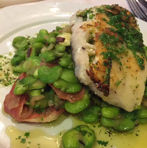 Merluza a la plancha, bañado con un sofrito de aceite de oliva, ajo y perejil, acompañado de habas peladas con jamón serrano. |