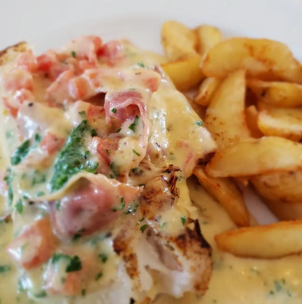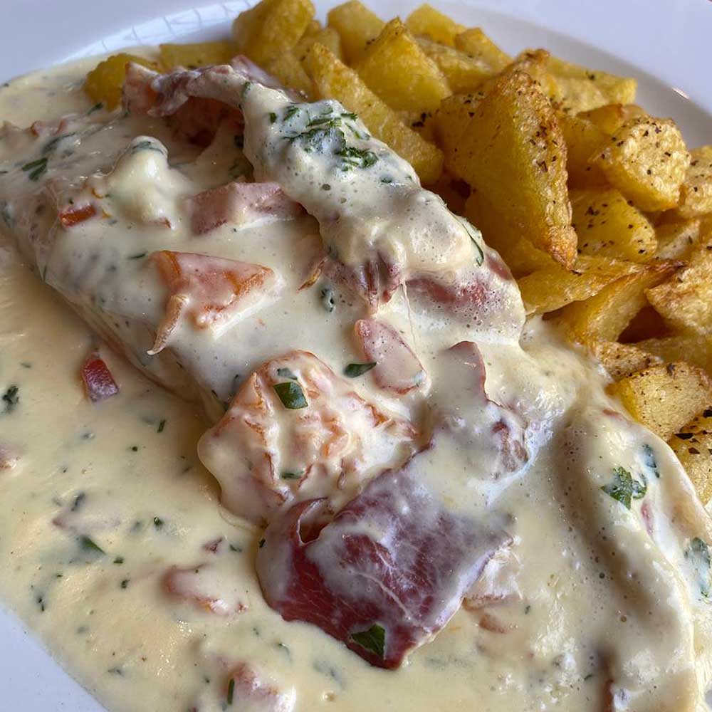 Merluza con salsa de mantequilla, crema, tomate concase, jamón serrano y ciboulette, acompañado de papas bravas. |