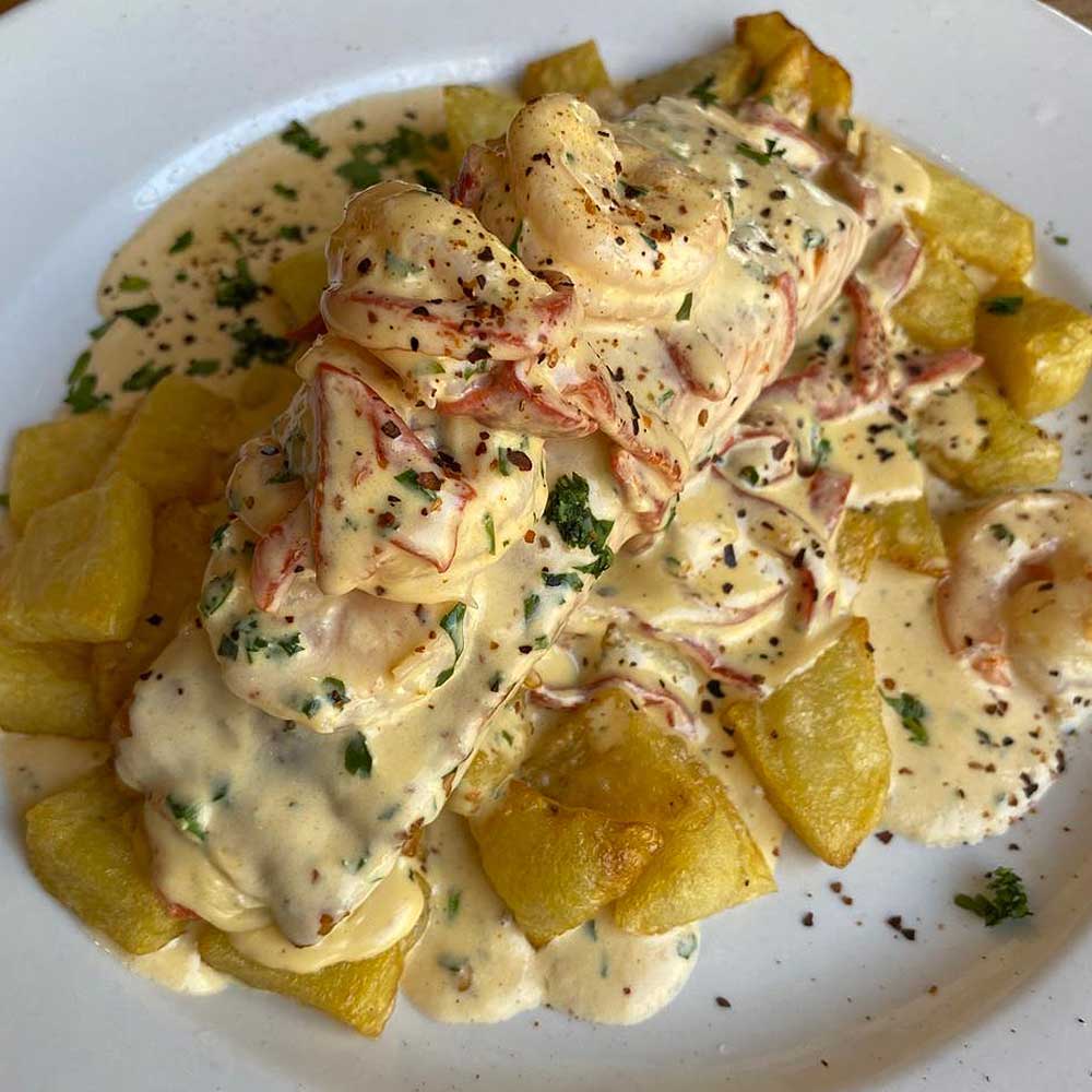 Merluza a la plancha montado sobre papas fritas, bañado en una salsa en base a ajo, crema, camarones, pimientos del piquillo y merkén. |