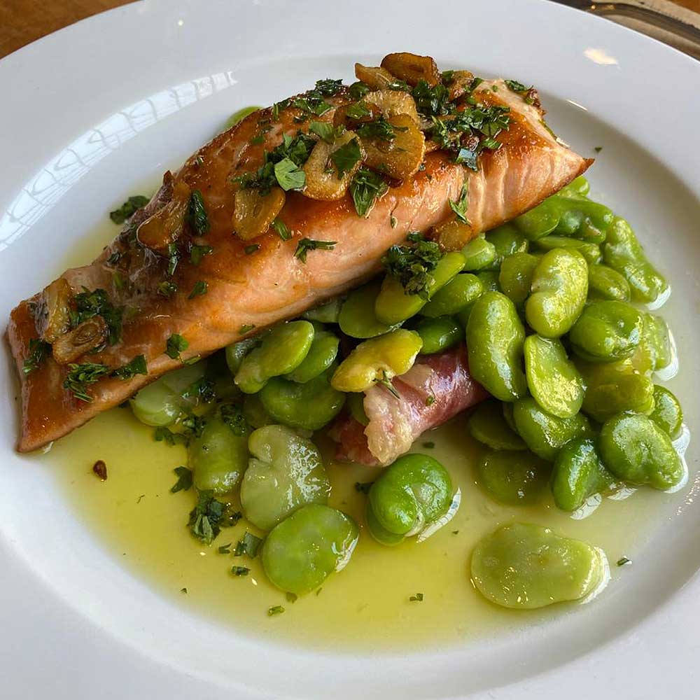 Salmón a la plancha, bañado con un sofrito de aceite de oliva, ajo y perejil, acompañado de habas peladas con jamón serrano. |