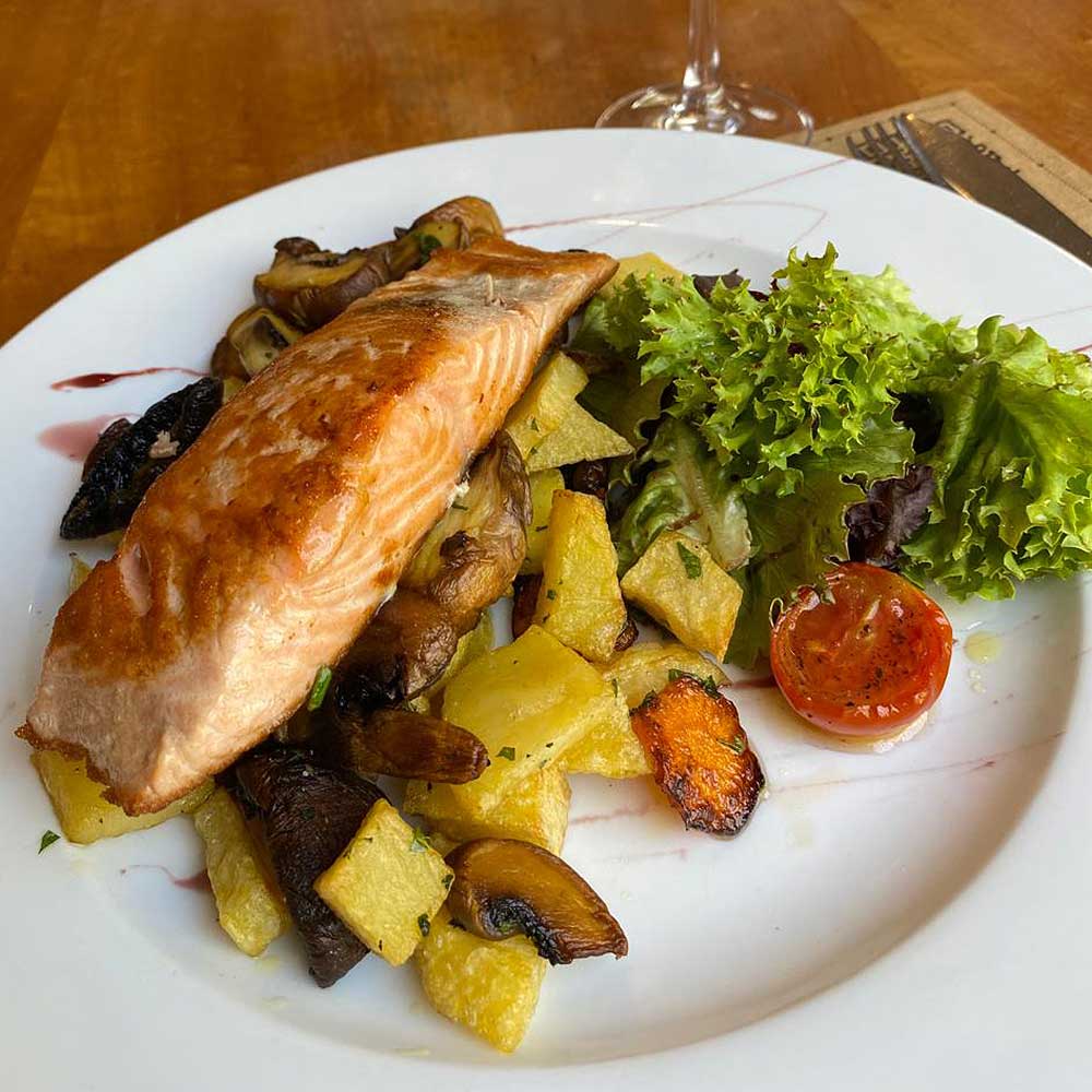 Salmón a la plancha con salsa de mantequilla, crema, tomate concase, jamón serrano y ciboulette, acompañado de papas bravas. |