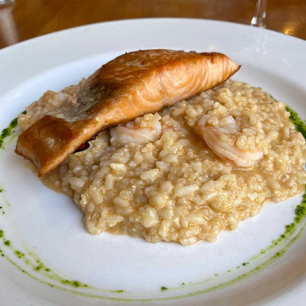 Salmón a la plancha compañado con rissoto de camarones ecuatorianos, terminado con caldo de congrio, mantequilla, queso parmesano y ciboulette. |